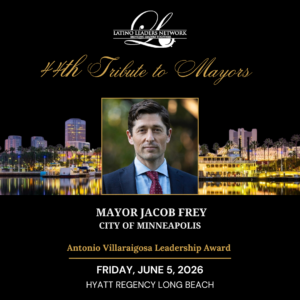 The Latino Leaders Network is excited to announce that the 44th Tribute to Mayors Reception will take place on Friday, June 5th, 2026, in Long Beach, CA, bringing together leaders from across the country for an evening of recognition and connection. This invitation-only event will award Minneapolis Mayor Jacob Frey with the Antonio Villaraigosa Leadership Award, honoring his leadership and ability to lead through complex challenges, foster unity, and build stronger, more resilient communities. The reception is held in conjunction with the U.S. Conference of Mayors’ summer meeting and serves as a premier national gathering, uniting mayors, public officials, business leaders, and community voices from across the country for an evening centered on leadership, collaboration, and impact. To learn more about the event and the Latino Leaders Network, please click here.